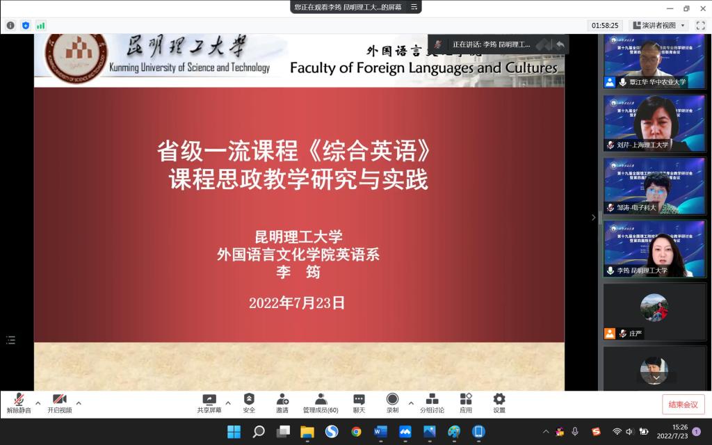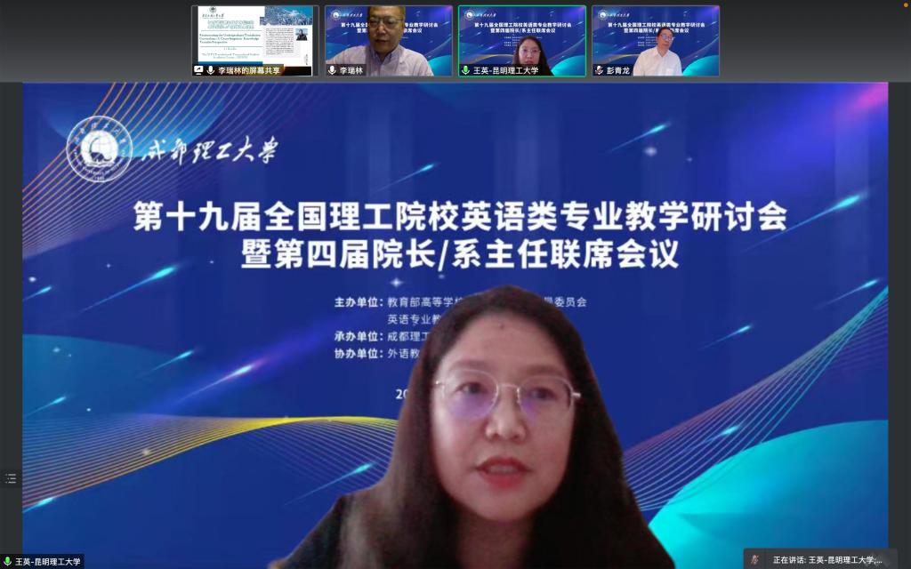 7月22-23日,由教育部高等学校外语专业教学指导委员会英语专业教学指导分委员会主办、成都理工大学承办的第十九届全国理工院校英语类专业教学研讨会暨第四届院长/系主任联席会议在线上举行。新利电竞官网登录三十余位专业教师参加了会议。