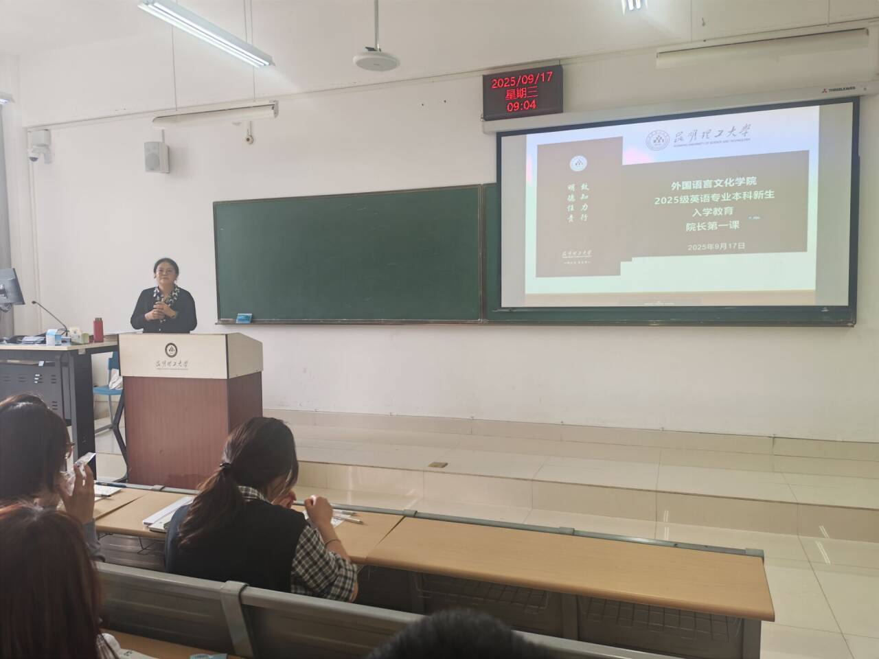 学院党委书记刘建平以思想引导为主题,为2025级本科新生讲授“开学第一课”,他向同学们介绍了学校、学院的基本情况,并紧扣新生成长需求,从校园适应、学业规划、心理健康、安全防护等多角度,为新生扣好大学生涯“第一粒扣子”。