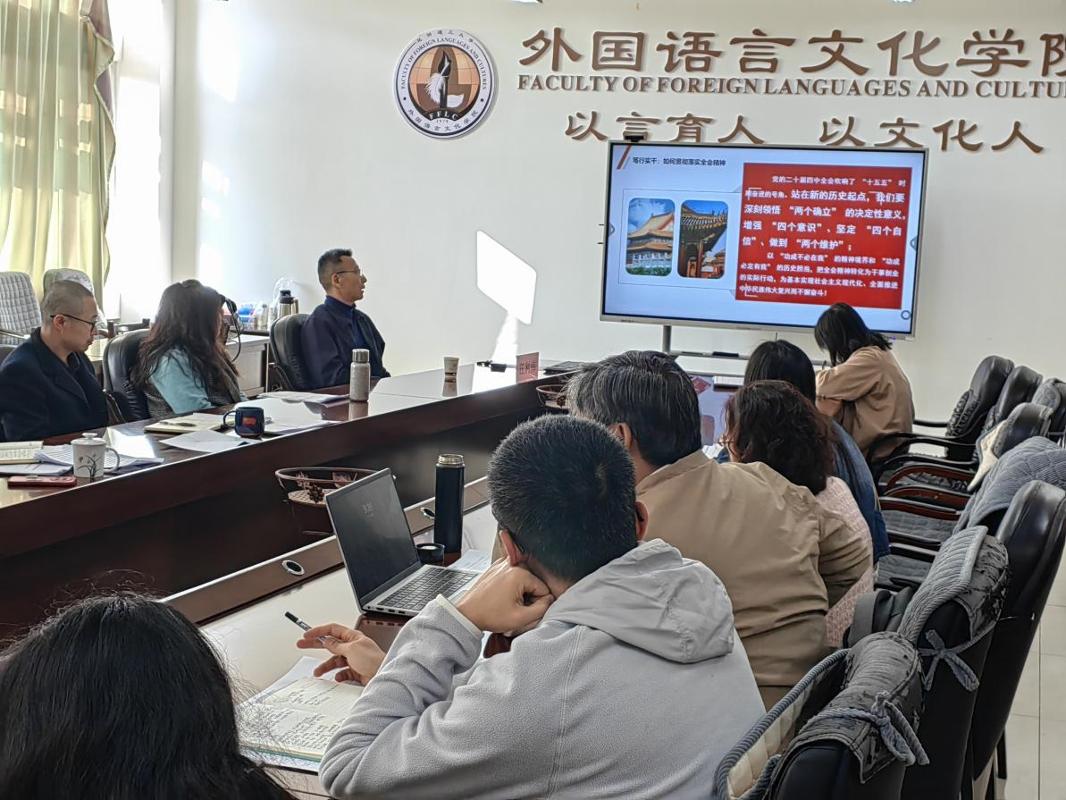 学院班子成员围绕贯彻落实全会精神,结合思想和工作实际作交流发言。刘建平提出三点要求:一是强化党的创新理论武装,坚持不懈用习近平新时代中国特色社会主义思想铸魂育人;二是进一步强化全面从严治党,为学院事业发展提供坚强保障;三是进一步改革创新,激发师生创造活力。刘建平强调,要把学习宣传贯彻党的二十届四中全会精神作为当前和今后一个时期的一项重大政治任务,切实把思想和行动统一到党中央决策部署上来,谋划实施好学院“十五五”规划,扎实推动学院高质量发展,奋力在学校“双一流”创建中开创外文学院新局面。