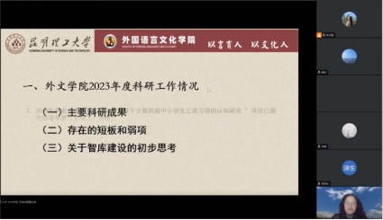 11月15日,新利18备用官网2023年度科研工作会暨2024年度国家社科基金项目申报工作推进会在线上召开。王英院长主持会议,学院副院长、英语系、大学外语第一教研部与第二教研部、研究生公共英语教研部、欧亚语教研部的主要负责人和分管科研负责人、学院近三年新进教师30余人参加会议。