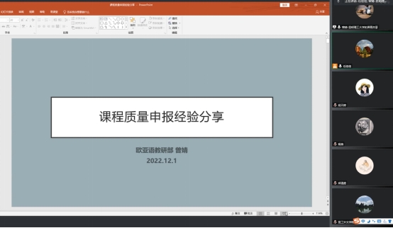 会议还邀请到学院曾婧博士作了国际一流课程建设与申报经验的讲座。曾婧老师提出科学规划课程建设的重要性,通过申报教师才能发现自己教学中的不足,做到教学相长;同时做好过程性评价过程中的资料搜集,进行电子化档案管理,做好线上资源和试题库的建设;做好学生学习反馈的跟踪,加强思政引领,切实提升课程的育人和育才实效。