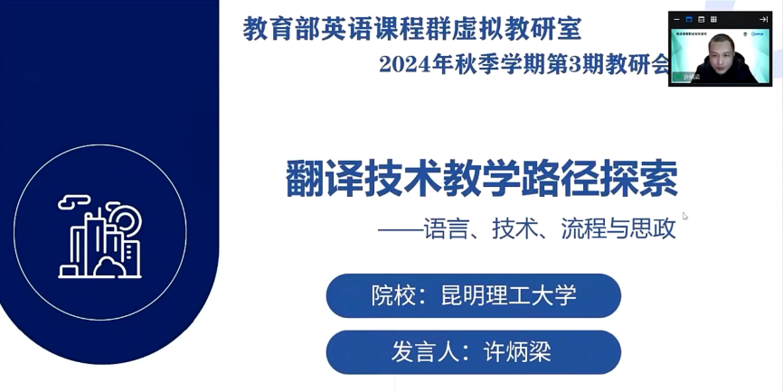 12月19日,由北京外国语大学与北京外研在线数字科技有限公司联合建设的教育部首批虚拟教研室建设试点——教育部“英语课程群虚拟教研室”成功举办了2024年秋季学期第3期教学研讨会。本次研讨会围绕“AI赋能英语课程改革和建设”这一主题展开,旨在探索如何通过人工智能赋能英语课程的改革与发展。我院教师许炳梁参加了本次研讨会,并做了主题分享“翻译技术教学路径探索——语言、技术、流程与思政”。