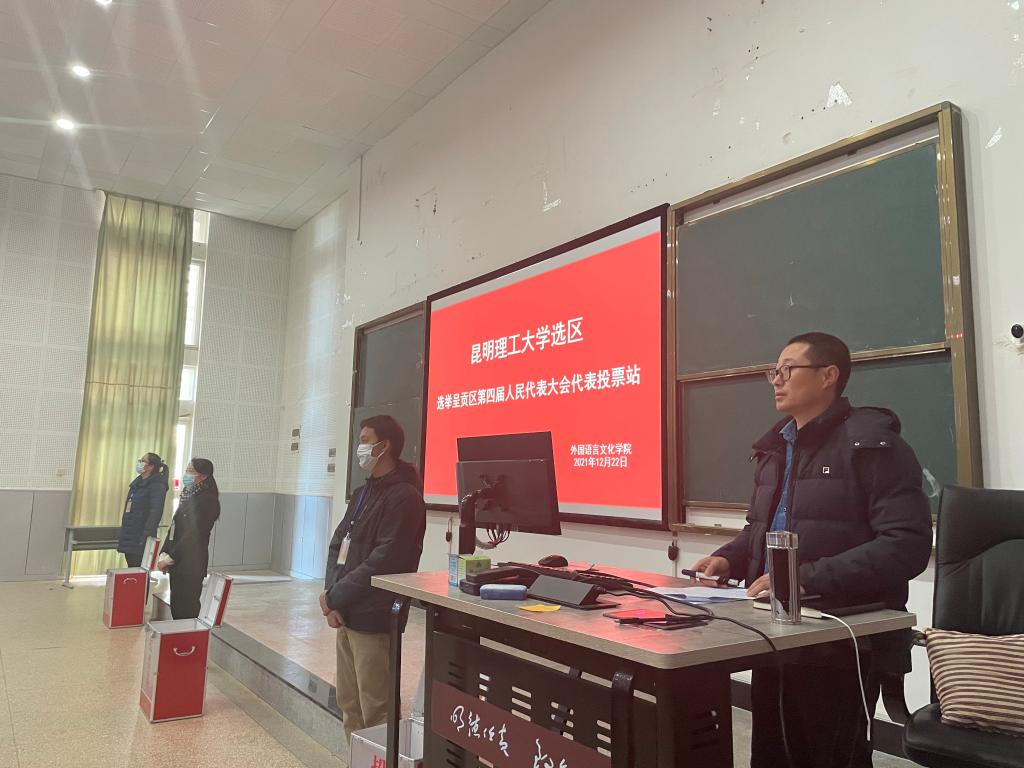 2021年12月22日上午,来自新利18备用官网的352名师生选民,来到新利18官方客服呈贡选区第四届人大代表选举外文学院投票站参加选举。选举大会在外文学院党委书记刘建平主持下,严格按照工作程序要求有条不紊进行。