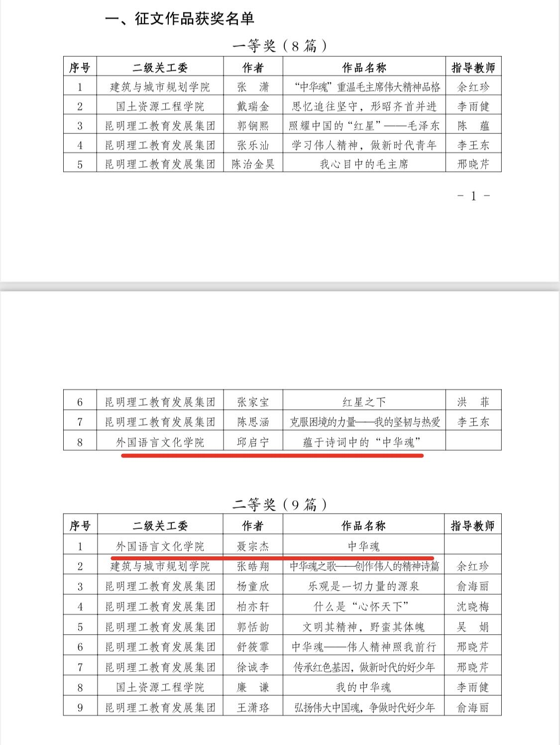 2023年“中华魂”主题活动是为纪念毛泽东同志诞辰130周年,引导广大青年学习毛泽东伟大精神品格,学习党史,为实现中华民族伟大复兴的中国梦不懈奋斗。邱启宁的征文作品以“蕴于诗词中的‘中华魂’”为题,通过毛泽东同志诗词中“不屈的斗争精神”,学习毛泽东伟大精神品格,激发人们的热情和奋斗动力,鼓舞广大人民为实现社会进步和民族独立作出努力;聂宗杰的征文作品以“中华魂”为题,通过“敢于斗争,善于斗争”“坚持真理,坚守理想”“践行初心,担当使命”,阐述了毛泽东同志的精神品格,结合习近平总书记在庆祝中国共产党建党100周年大会上的讲话精神,表达了作为当代青年,要继承和发扬中华魂精神,坚定地践行伟大建党精神,努力实现中华民族伟大复兴。本次全校共8篇征文获一等奖,9篇获二等奖,10篇获三等奖,4个单位获优秀组织奖。
